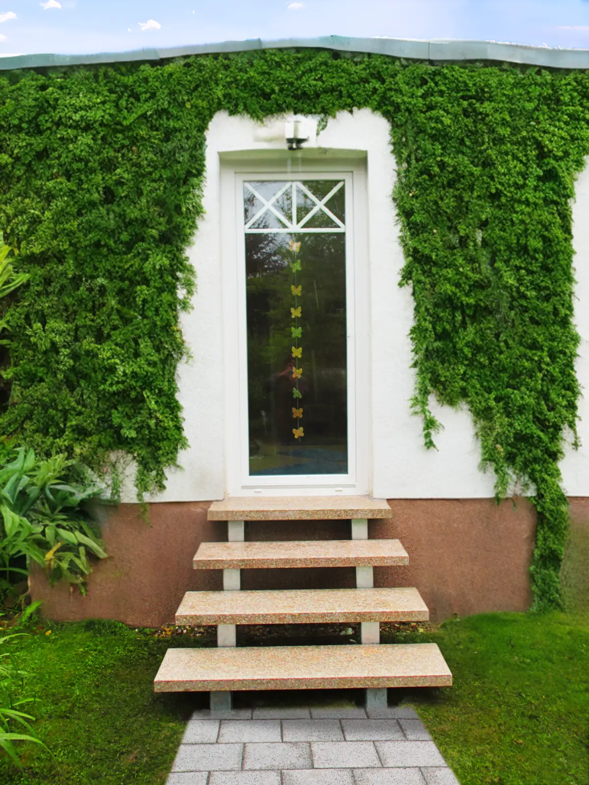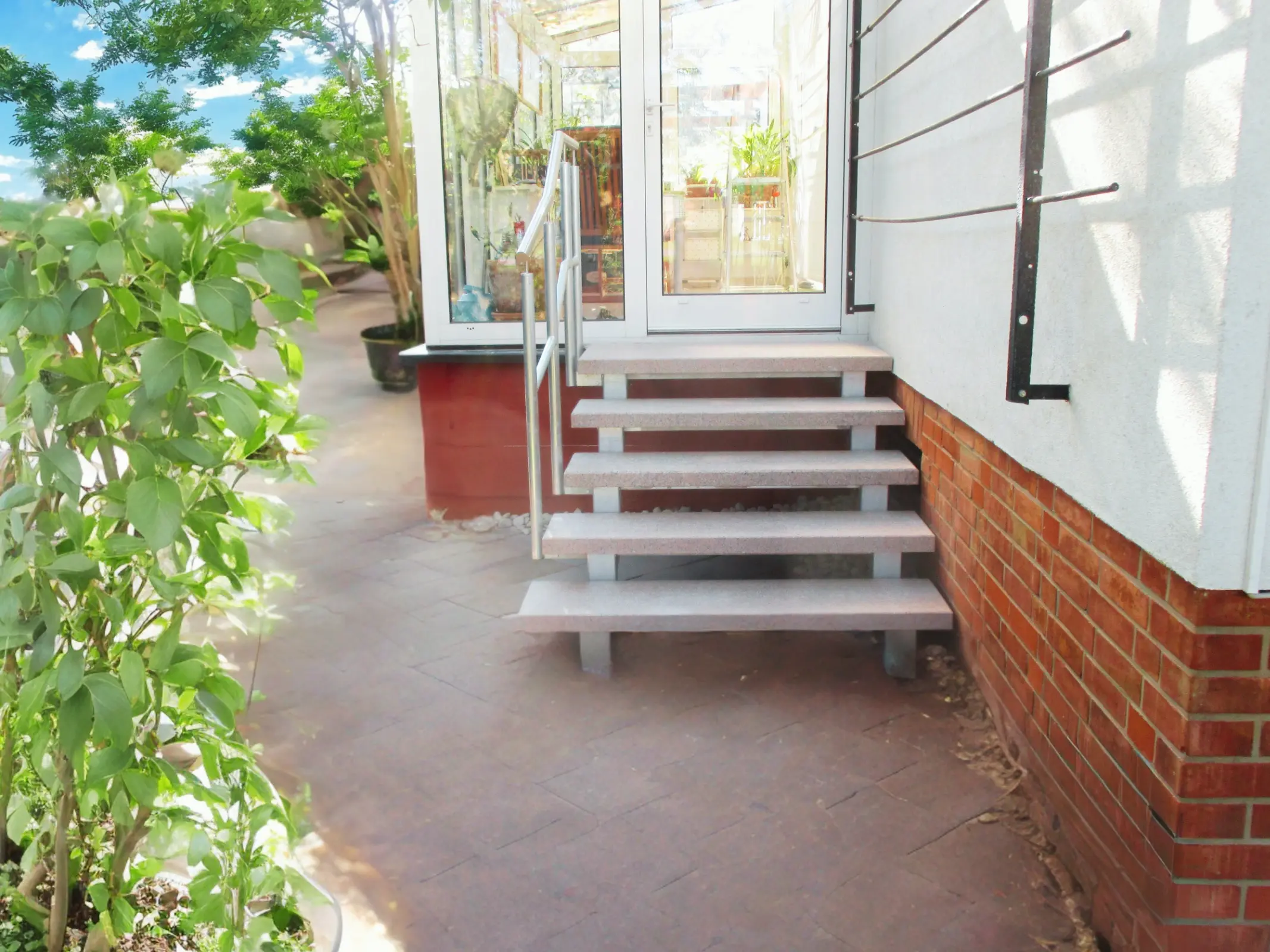 Eine freitragende Außentreppe mit geradem Treppenverlauf zeichnet sich durch ihre schlichte, gerade Struktur aus, die von der Haustür in direkter Linie nach vorn verläuft. Anders als bei traditionellen geschlossenen Treppen besteht eine freitragende Treppe aus offenen Stufen, die nicht durch Setzstufen verbunden sind. Dies verleiht der Treppe ein leichteres, eleganteres Aussehen und ermöglicht es dem Bereich unter der Treppe, frei zu bleiben, was besonders in Bezug auf die Belüftung und Entwässerung von Vorteil ist.