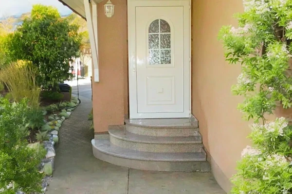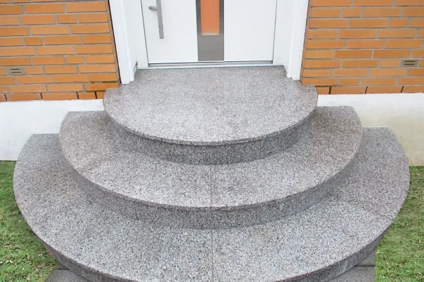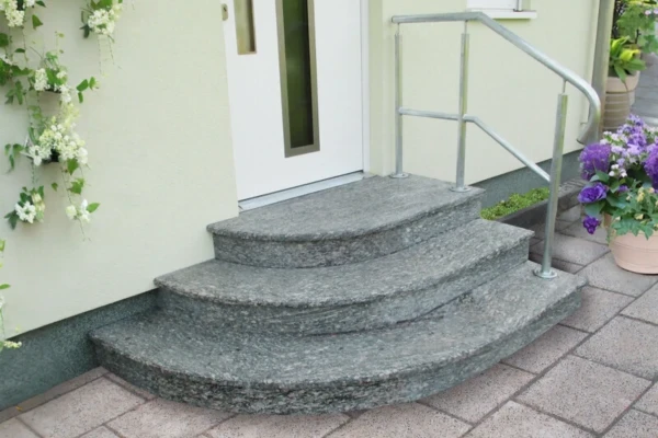 Besonders hervorzuheben ist, dass die Setzstufen nicht wie üblich aus kleinen Streifen bestehen, sondern aus 5 Rundbogen-Segmenten. Diese einzigartige Konstruktion wird von keinem anderen Hersteller angeboten. Die Treppen bestehen aus 3 cm starken, geflammten Trittstufen und 2,5 cm starken, geschliffenen Setzstufen aus hochwertigem, komplett frost- und rutschsicherem Granit in 7 verschiedenen Farbmuster – passend zu jedem Haus und der entsprechenden Unterkonstruktion. Wir bieten auch Betontreppen an, die in einer breiten Farbpalette erhältlich sind.