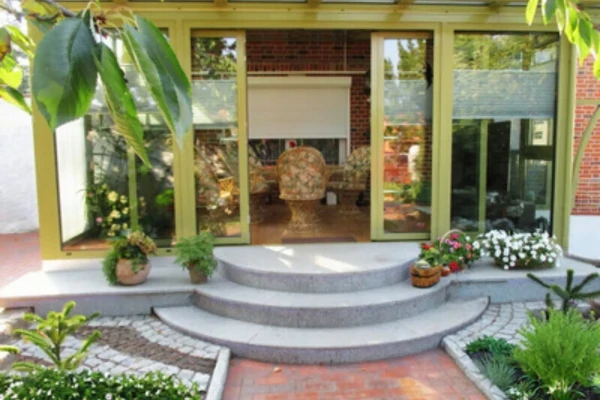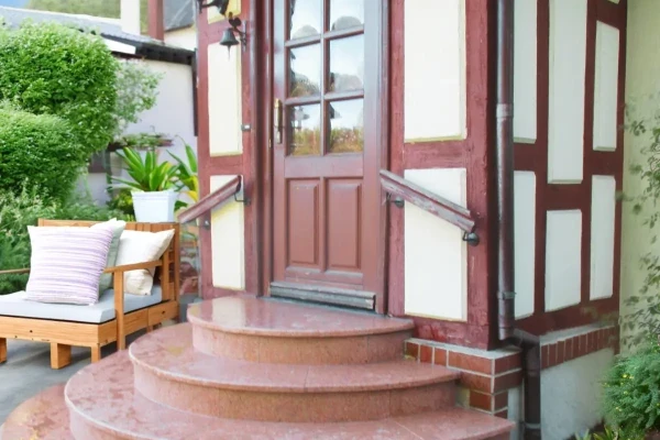 Die Trittstufen sind mit einer großen Fase nach außen und einer kleinen Fase (Schattenfuge) untereinander verlegt. Das Podest wird in den Standardbreiten von 140 cm und 200 cm angeboten. Sonderlösungen sind auf Anfrage möglich. Außerdem bieten wir Ihnen den werkseitigen Einbau von hochwertigen, eleganten und robusten Fußabstreifern in verschiedenen Ausführungen an.