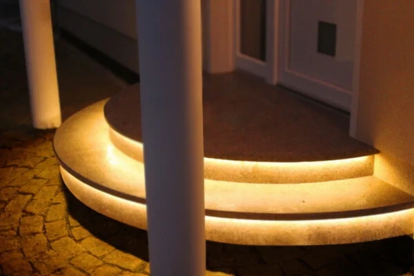 Für unsere geschlossenen halbrunden Außentreppen bieten wir eine einzigartige LED-Beleuchtung an, die in der Unterkante des Überstandes der Trittstufe und des Podestes integriert ist. Diese Beleuchtung strahlt nach unten, stellt ein indirektes Licht dar (blendet also nicht) und beleuchtet gleichzeitig Ihre Trittflächen und den Gehweg, was für mehr Sicherheit bei Dunkelheit sorgt.
