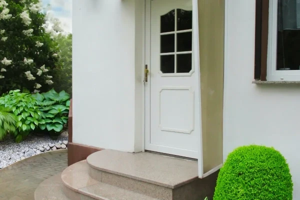 Diese geschlossene halbrunde Außentreppe eignet sich ideal für Hauseingänge oder Terrassen mit einem Höhenunterschied von bis zu 85 cm, was maximal 5 Steigungen bedeutet – 4 Stufen plus Podest á 17 cm (flachere Varianten sind ebenfalls möglich).