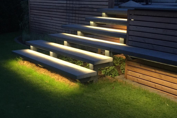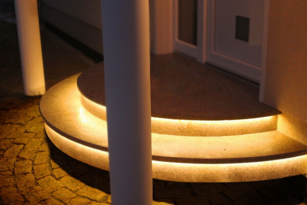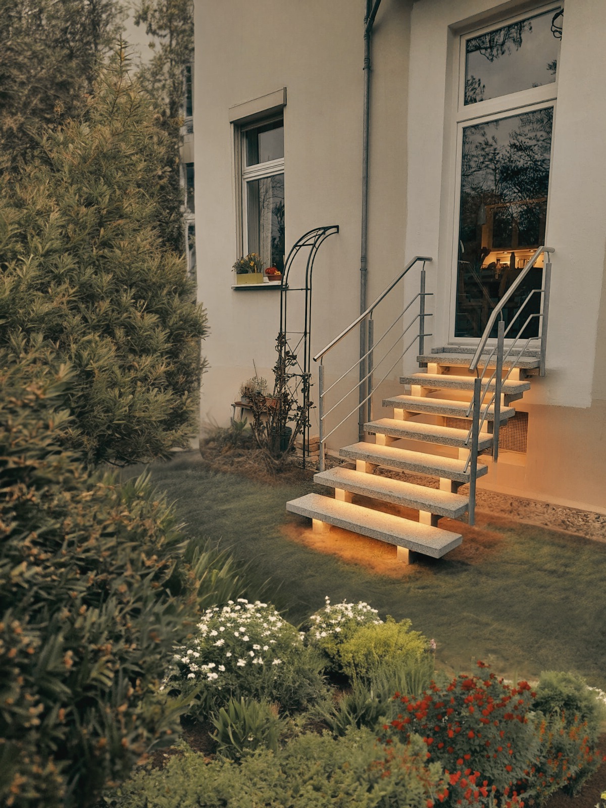 LED-Beleuchtung für Außentreppen – Sicherheit und Stil bei Dunkelheit Unsere einzigartige LED-Beleuchtung für Außentreppen sorgt nicht nur für mehr Sicherheit, sondern auch für eine stilvolle Optik. Die LED-Bänder werden in der Unterkante der Trittstufen und des Podestes installiert und strahlen nach unten ab, wodurch ein indirektes, blendfreies Licht erzeugt wird. Diese Beleuchtung hebt die Trittflächen und den Gehweg hervor und bietet somit eine sichere Beleuchtung bei Dunkelheit.