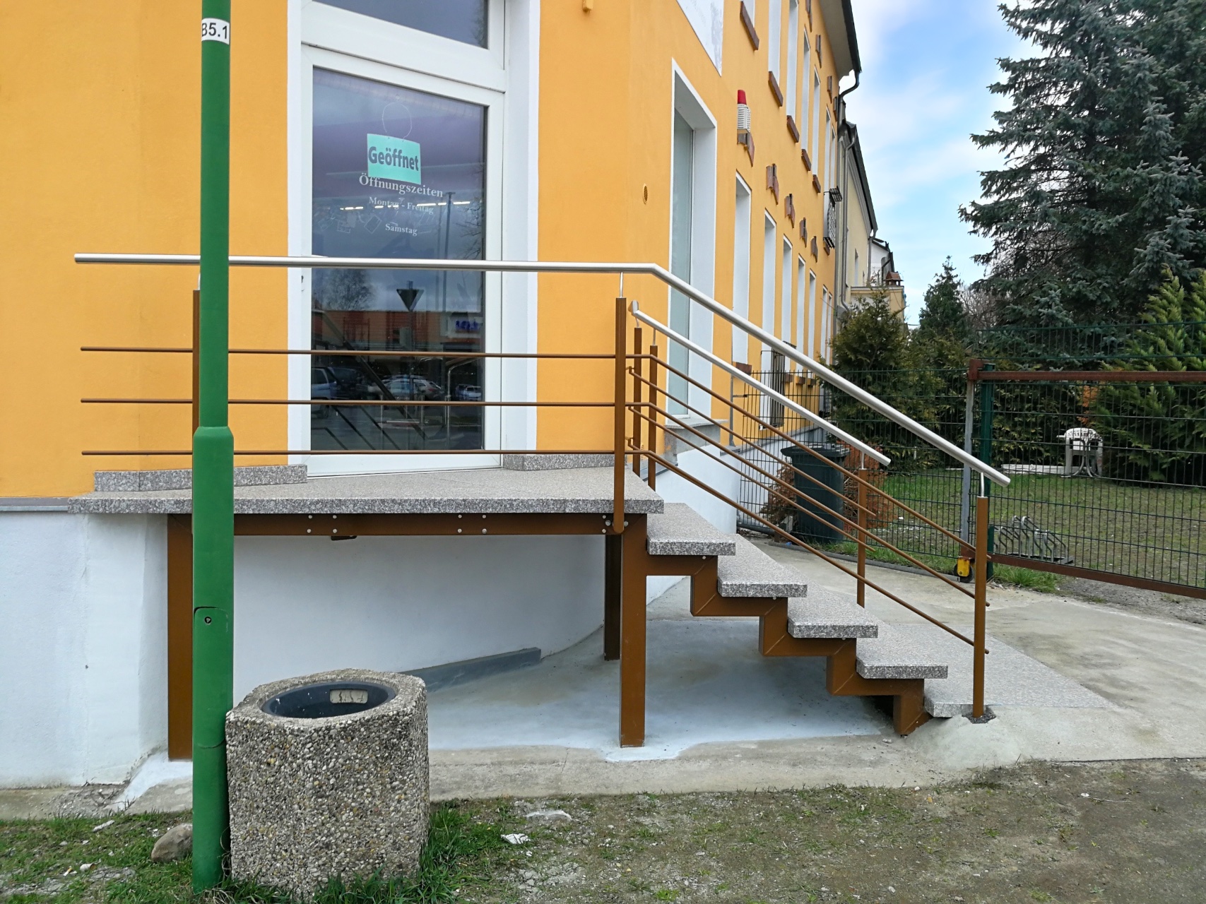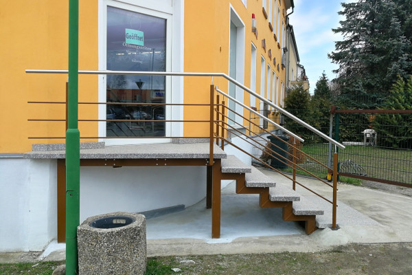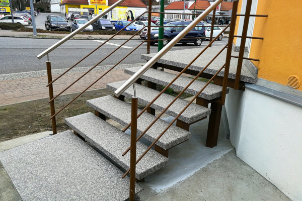 Ein Beispiel für unseren umfassenden Ansatz ist das Projekt für ein Ladengeschäft, bei dem der alte, massive Treppenblock demontiert und durch eine individuell angepasste freitragende Treppe ersetzt wurde. Podest und Stufen aus Granit haben eine rutschfeste Oberfläche. Die Geländerrohre sind feuerverzinkt und pulverbeschichtet, die Handläufe aus Edelstahl. Der Gesamtpreis betrug ca. 7500 €.