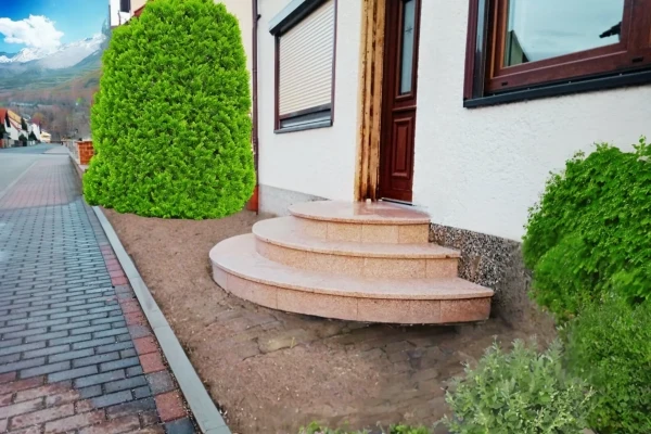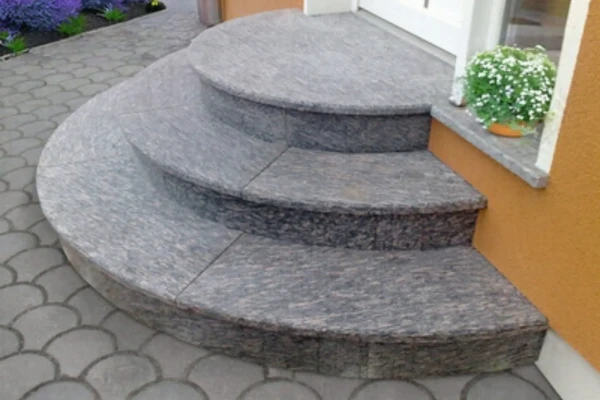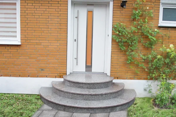 Besonders hervorzuheben ist, dass die Setzstufen nicht wie üblich aus kleinen Streifen bestehen, sondern aus 5 Rundbogen-Segmenten. Diese einzigartige Konstruktion wird von keinem anderen Hersteller angeboten. Die Treppen bestehen aus 3 cm starken, geflammten Trittstufen und 2,5 cm starken, geschliffenen Setzstufen aus hochwertigem, komplett frost- und rutschsicherem Granit in 7 verschiedenen Farbmuster – passend zu jedem Haus und der entsprechenden Unterkonstruktion. Wir bieten auch Betontreppen an, die in einer breiten Farbpalette erhältlich sind.