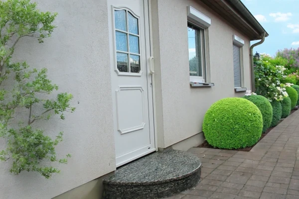 Diese geschlossene halbrunde Außentreppe eignet sich ideal für Hauseingänge oder Terrassen mit einem Höhenunterschied von bis zu 85 cm, was maximal 5 Steigungen bedeutet – 4 Stufen plus Podest á 17 cm (flachere Varianten sind ebenfalls möglich).