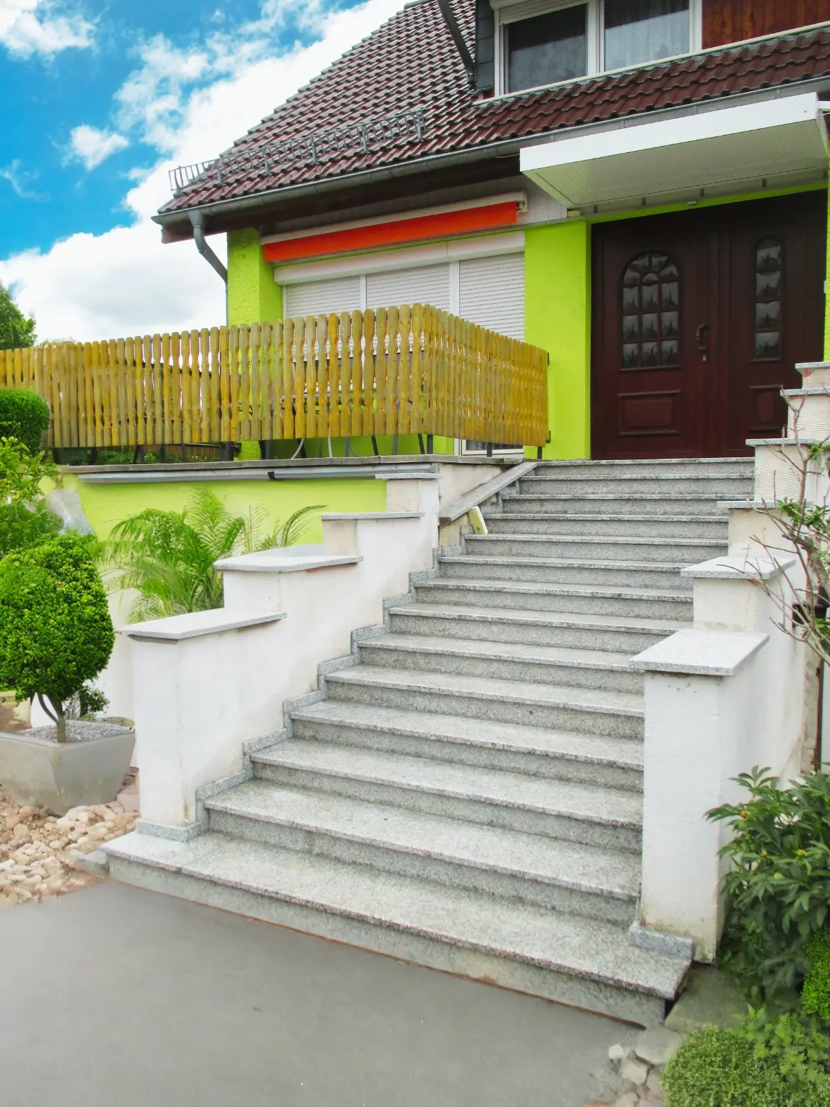 Die Trittstufen haben eine Stärke von 3 cm und die Setzstufen 2 cm. Beide Elemente sind präzise gefertigt und miteinander verbunden, um eine harmonische, gleichmäßige Optik zu gewährleisten. Dank der Vielfalt an Farbmustern passen sie perfekt zu jedem Hausstil.
