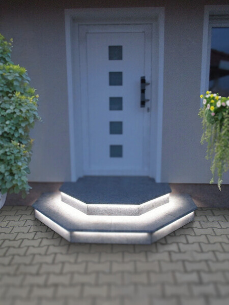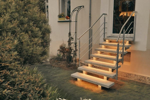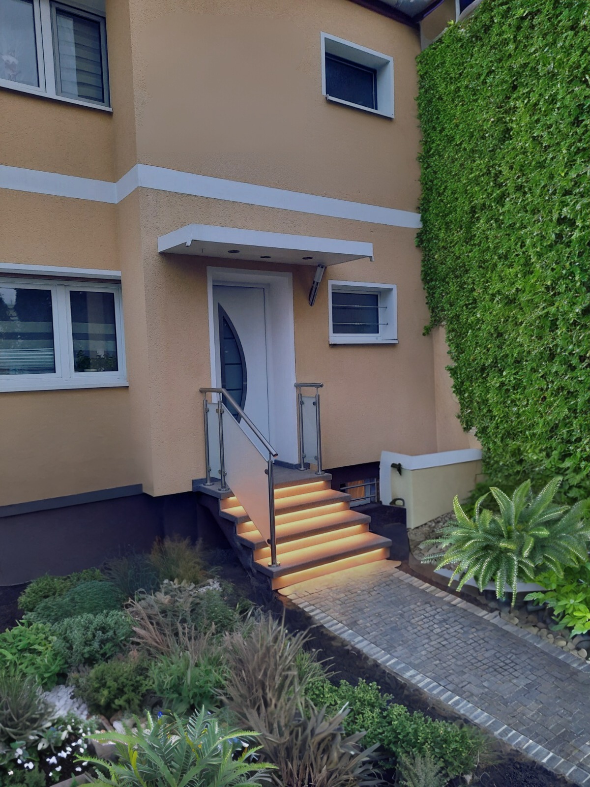LED-Beleuchtung für Außentreppen – Sicherheit und Stil bei Dunkelheit Unsere einzigartige LED-Beleuchtung für Außentreppen sorgt nicht nur für mehr Sicherheit, sondern auch für eine stilvolle Optik. Die LED-Bänder werden in der Unterkante der Trittstufen und des Podestes installiert und strahlen nach unten ab, wodurch ein indirektes, blendfreies Licht erzeugt wird. Diese Beleuchtung hebt die Trittflächen und den Gehweg hervor und bietet somit eine sichere Beleuchtung bei Dunkelheit.