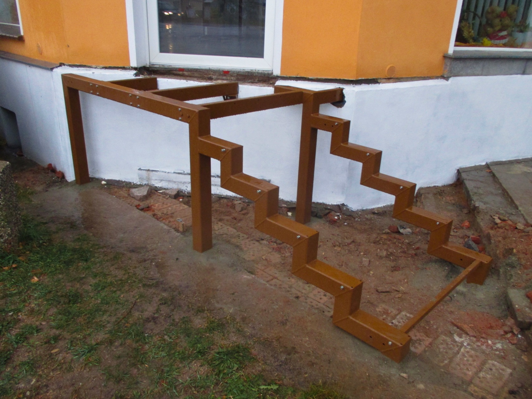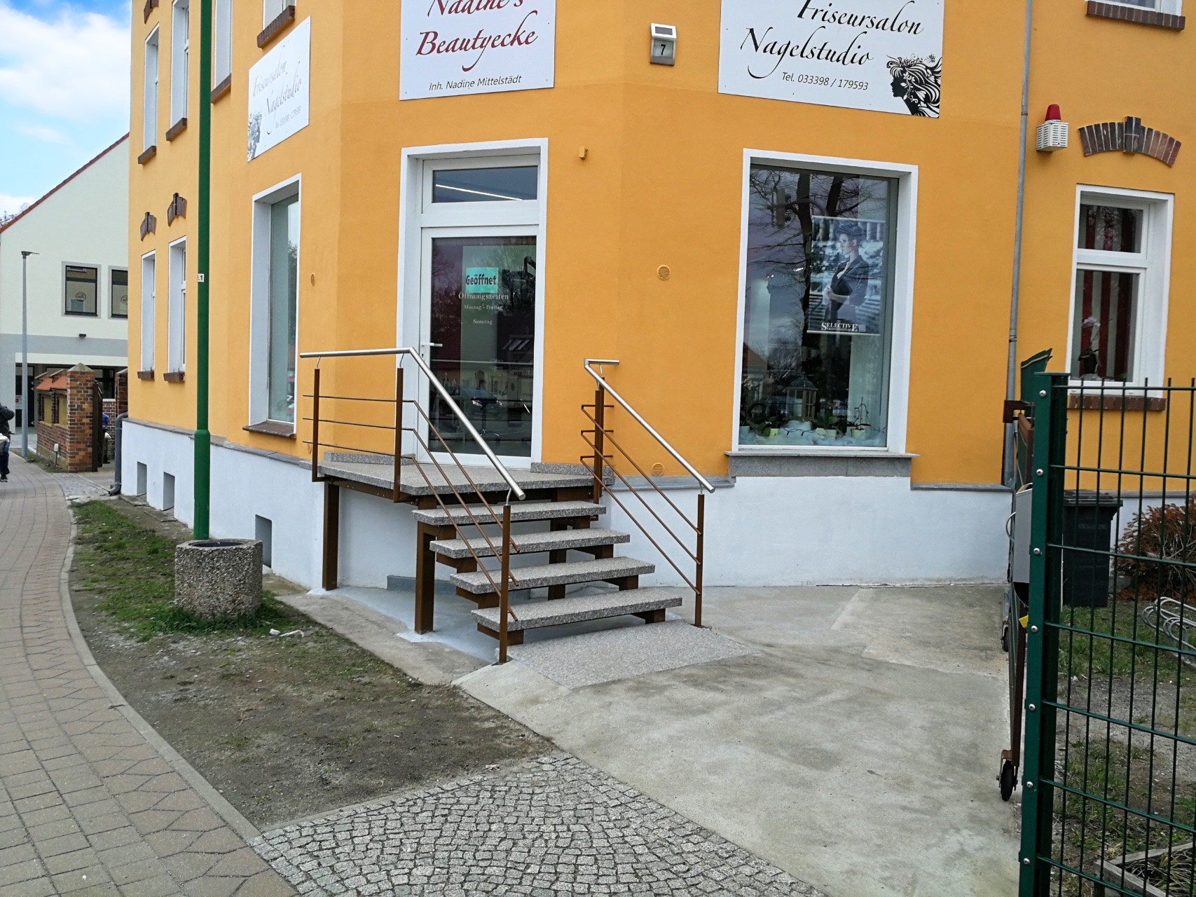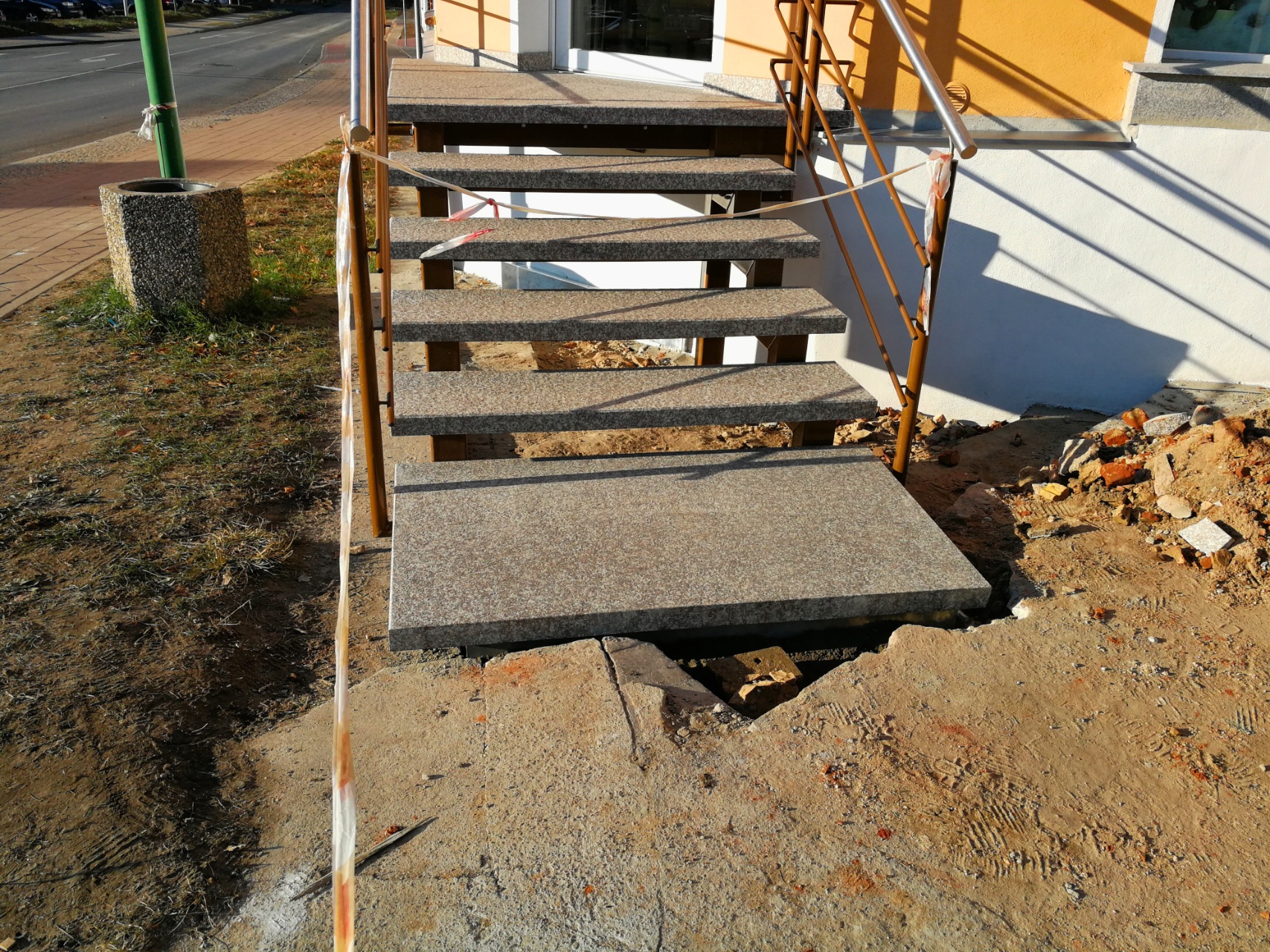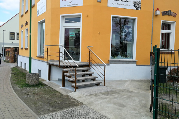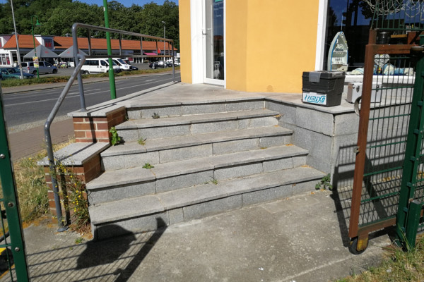 Ein Beispiel für unseren umfassenden Ansatz ist das Projekt für ein Ladengeschäft, bei dem der alte, massive Treppenblock demontiert und durch eine individuell angepasste freitragende Treppe ersetzt wurde. Podest und Stufen aus Granit haben eine rutschfeste Oberfläche. Die Geländerrohre sind feuerverzinkt und pulverbeschichtet, die Handläufe aus Edelstahl. Der Gesamtpreis betrug ca. 7500 €.